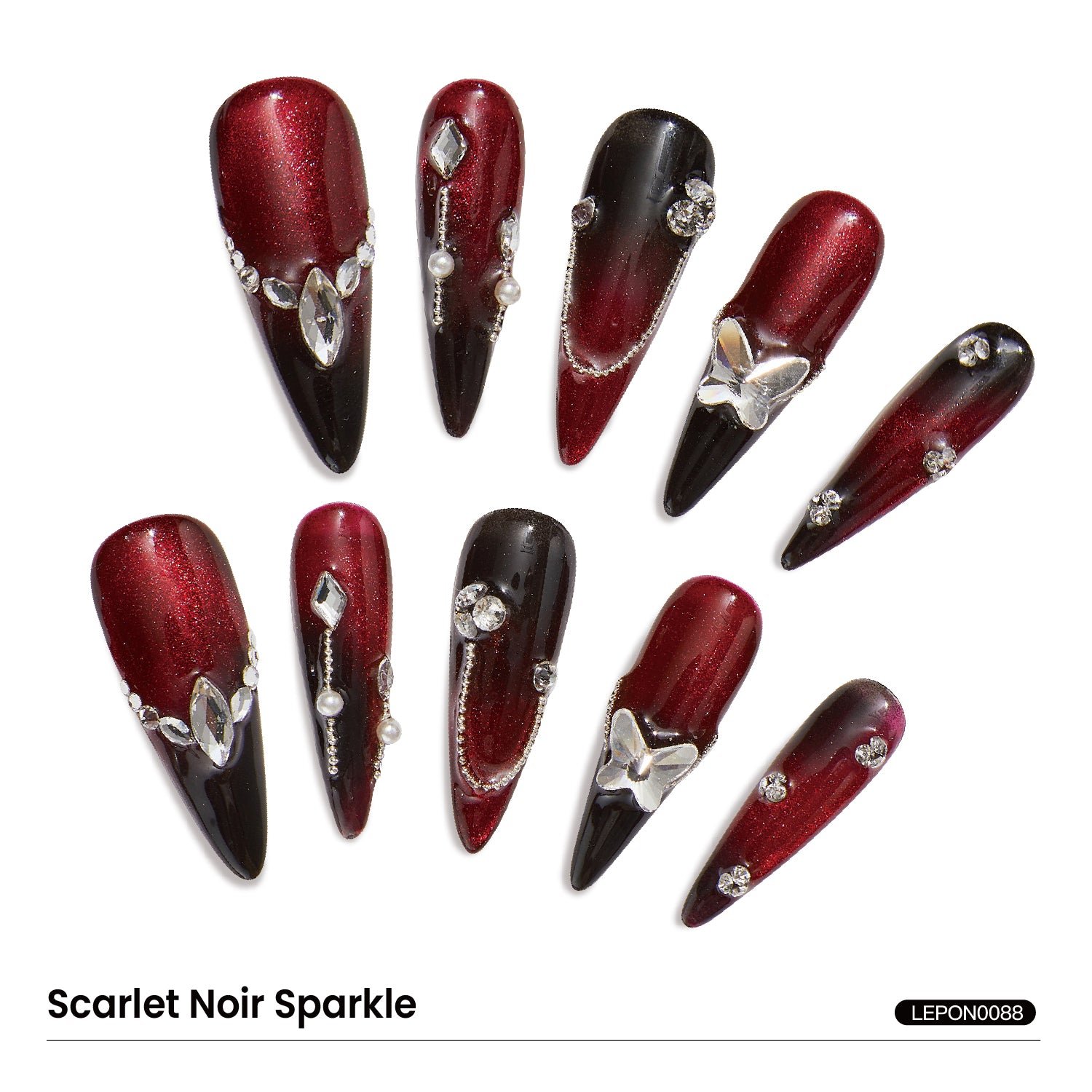Luxury Long-Length Stiletto-Shaped Red And Black Change Cat Eye Swarovski Crystals Decorative Handmade Nail Art Set